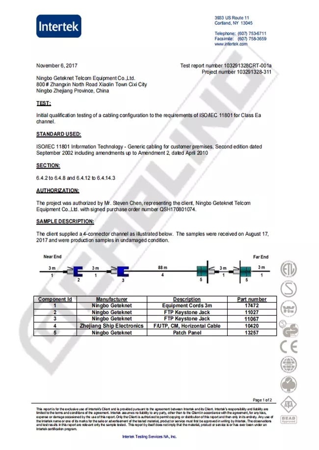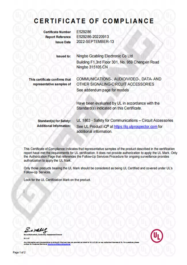 Gcabling products are precisely engineered to standards and have passed the testing in the 3rd labs of UL, Intertek, SGS, BV, TÜV Rheinland to get test report/Certificate of UL, ETL,CE, CPR, RoHS, Reach etc.